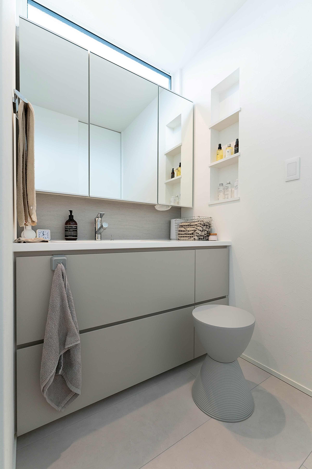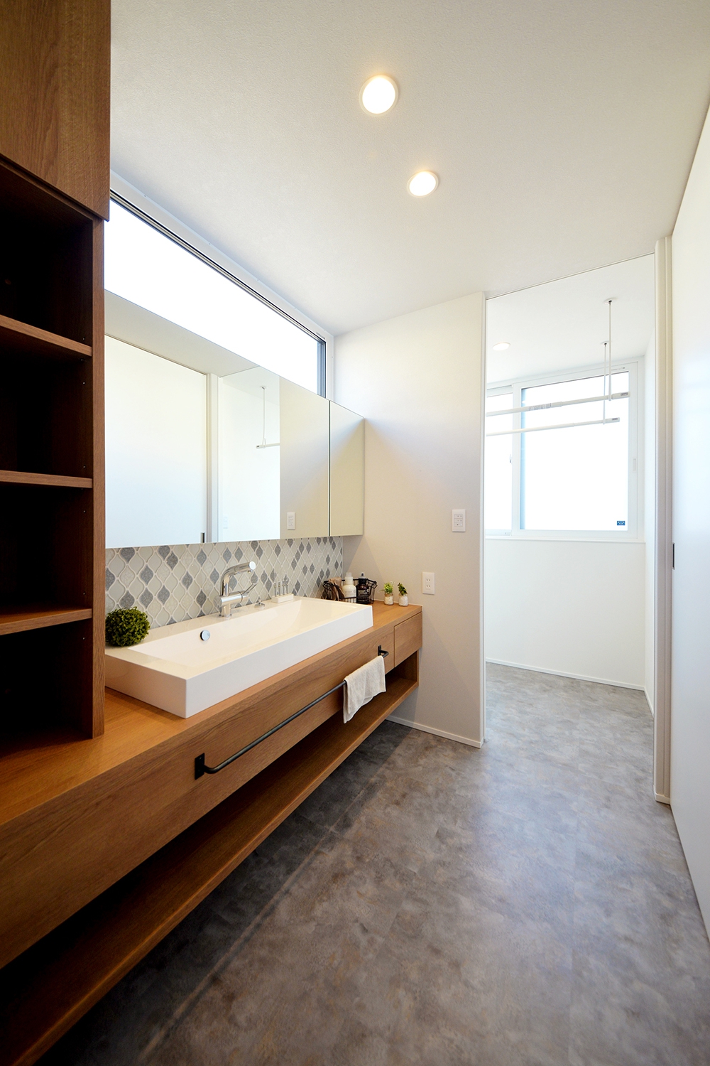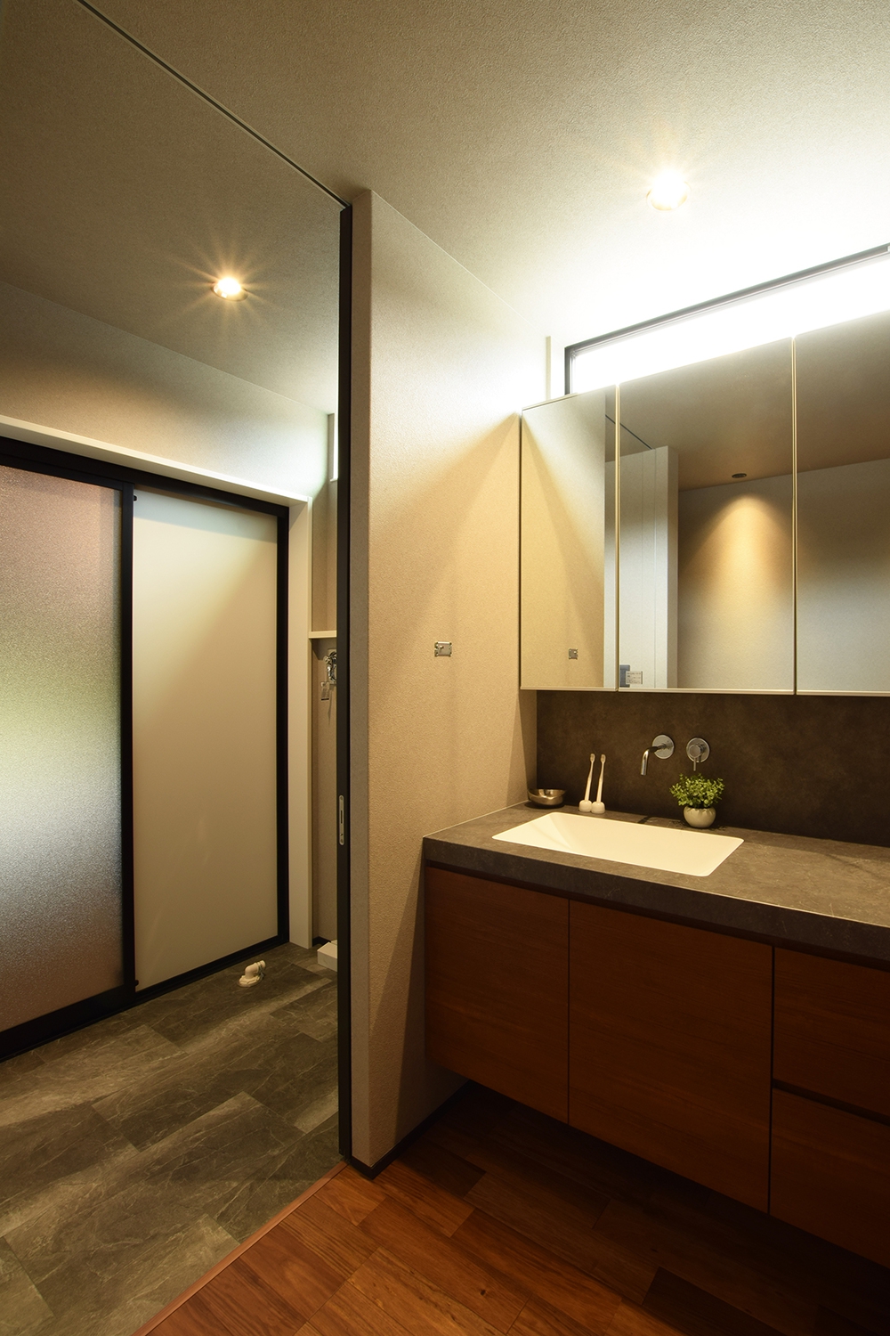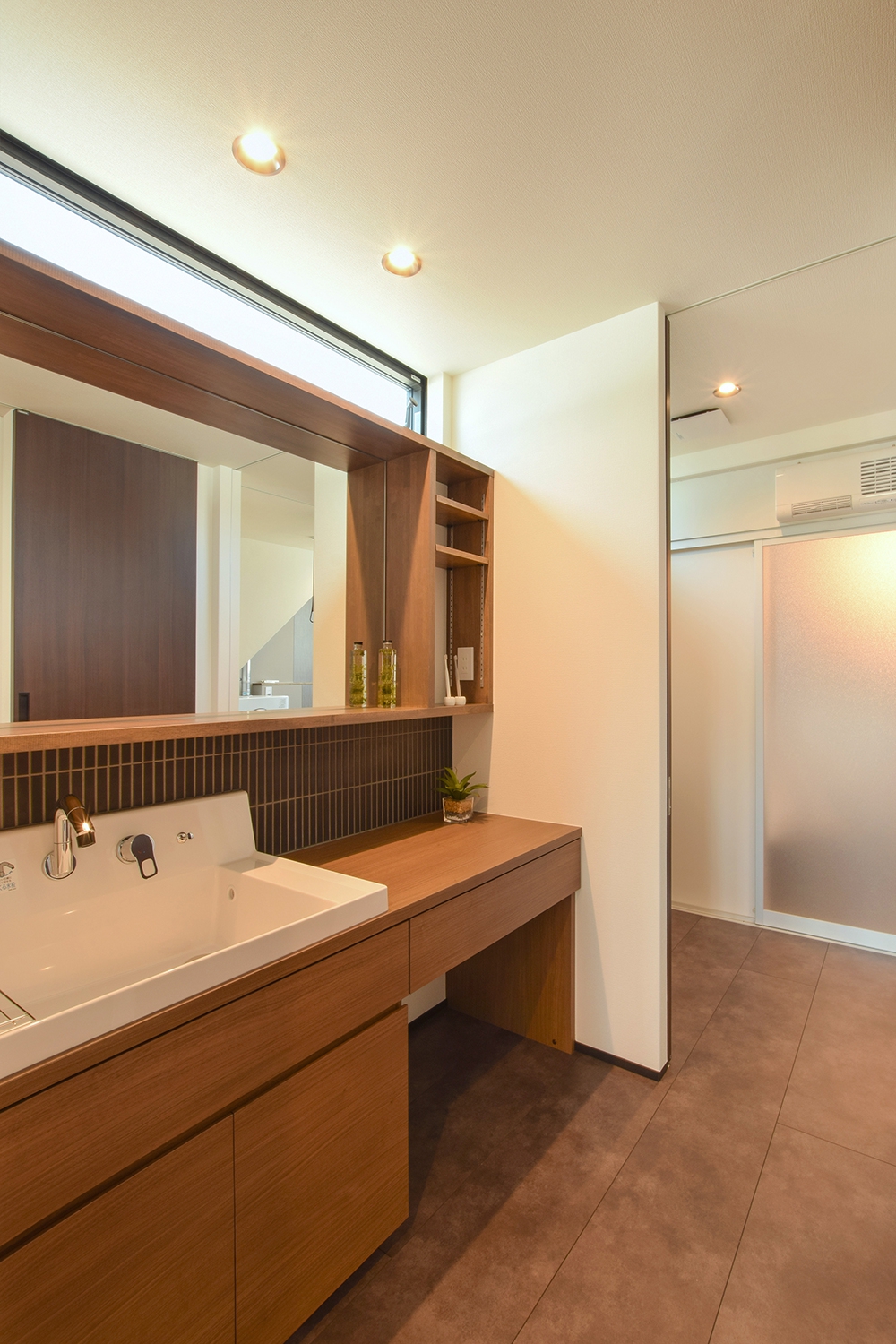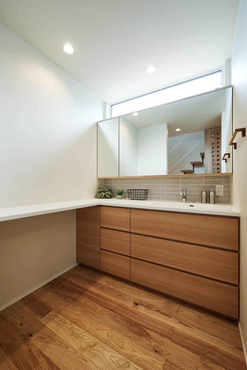 スリット窓を設けた洗面は、広いカウンターや鏡面収納などで使いやすく