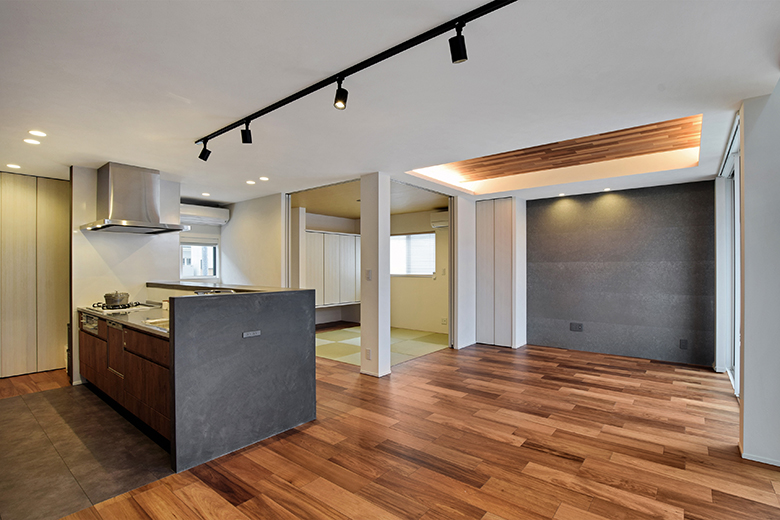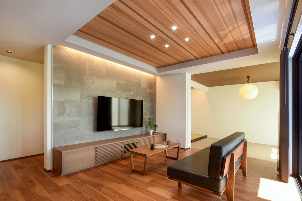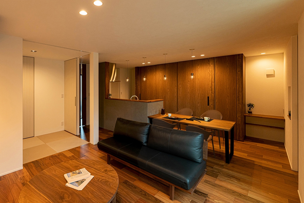 和室と隣接したLDK。シャープな印象と木目のぬくもりが調和した飽きのこない空間デザイン