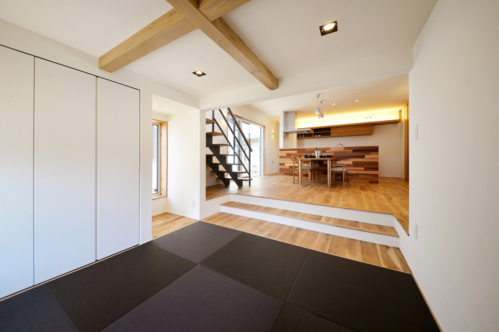 扉を開け放つとLDKと繋げて広く使え、扉を閉めれば個室として来客を泊めることもできる和室。家の雰囲気に合うよう、柔らかな色の畳を採用しオシャレに。収納もたっぷりで便利