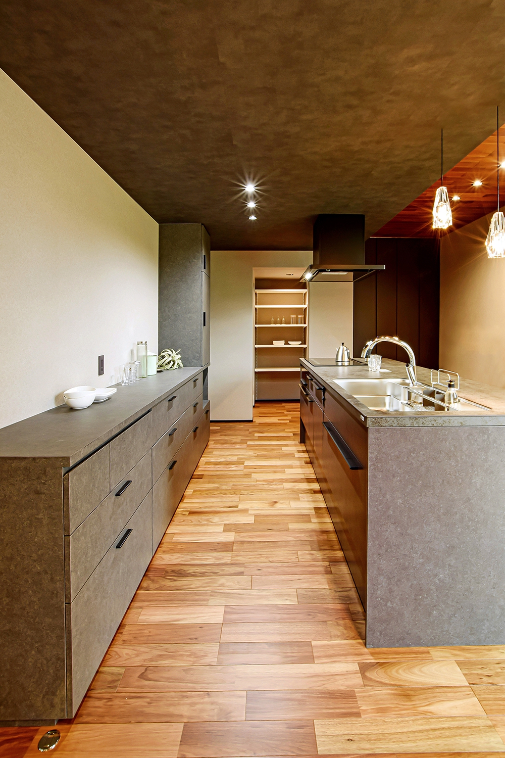 天井には無垢材のチーク材を使用し、床の色味と統一感を出した。キッチンの手元を照らすガラスの照明がアクセントに