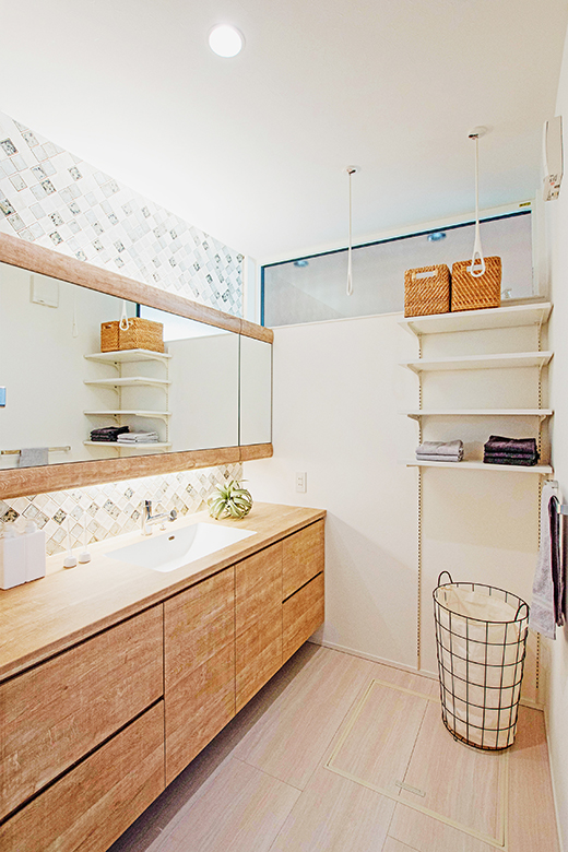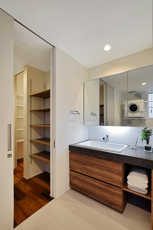 2世帯は洗面に家族が並ぶ機会もしばしば。大人ふたりが並べるサイズの一面鏡を採用。化粧台としても活躍
