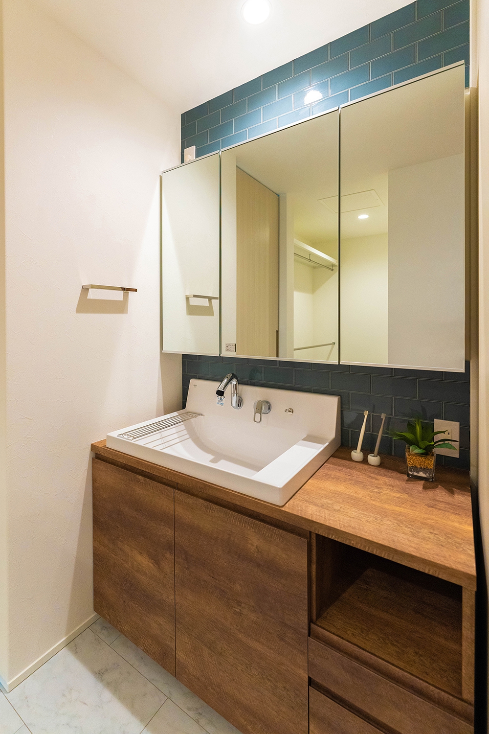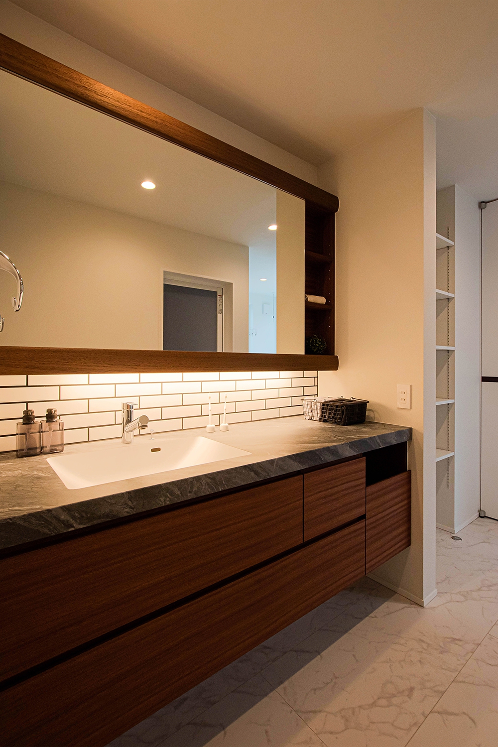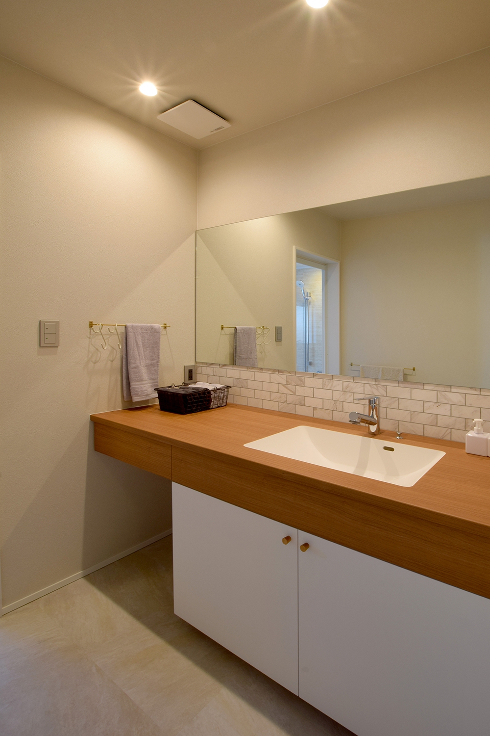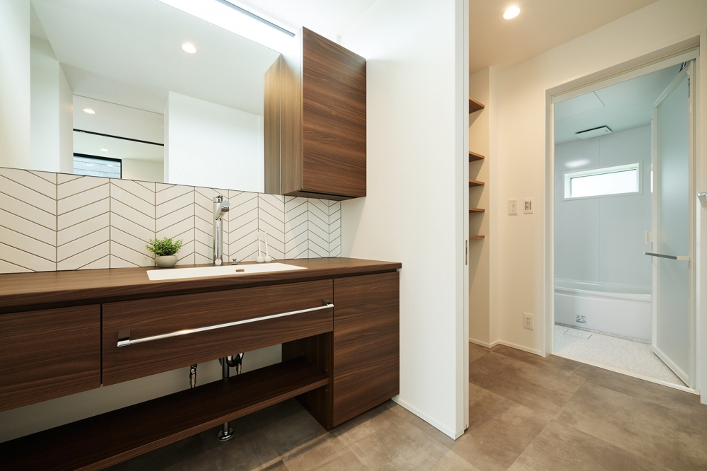 モールテックス天板と白タイルが調和した造作洗面化粧台 。無垢材の自然な質感が空間全体を引き締め、モダンで心地よい雰囲気を演出