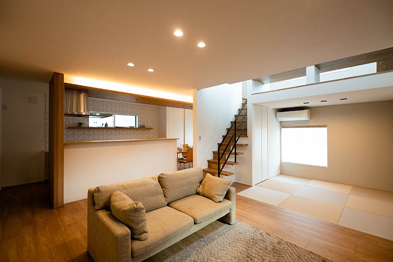 キッチンにいながら子どもの様子を見守れるよう、畳スペースをキッチン前に配置した