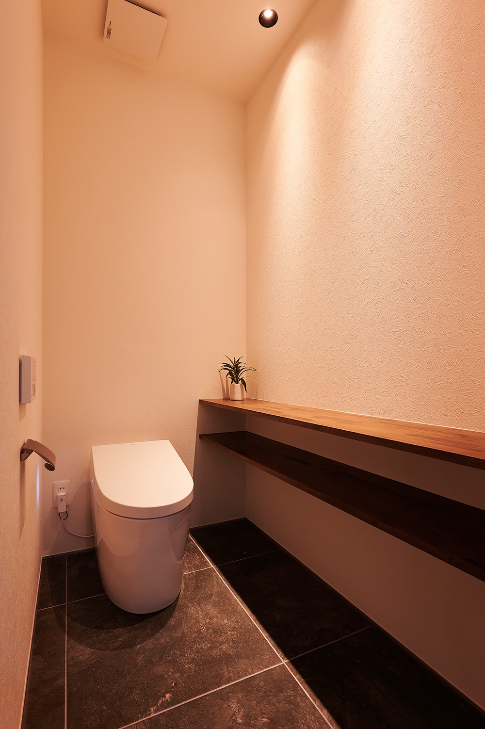 1Fのトイレはダークブラウンでまとめ、間接照明で高級感を演出