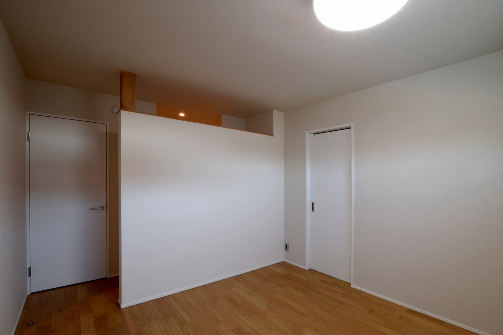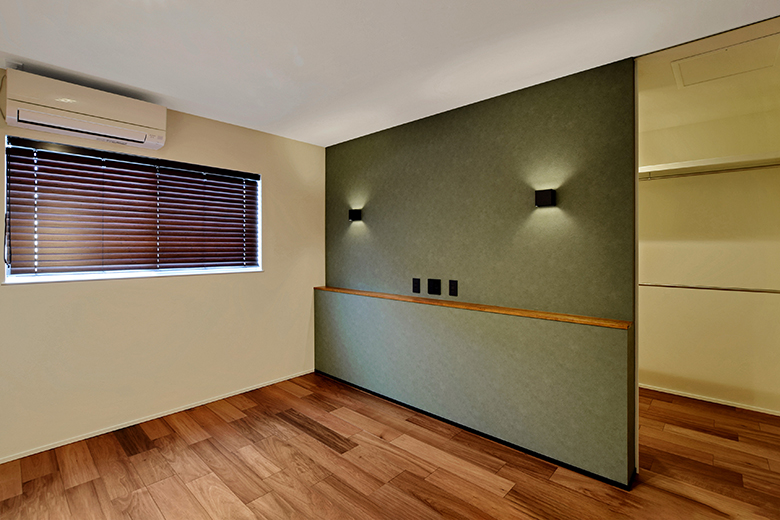 小上がりになっている2階の主寝室。間接照明がホテルライクな上質さを演出。壁紙には「山梨」と「愛媛」を採用