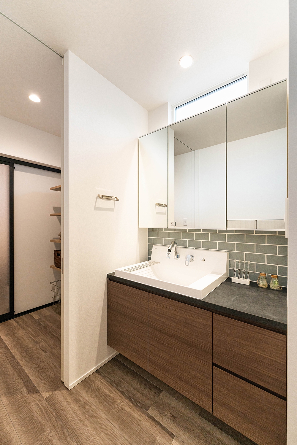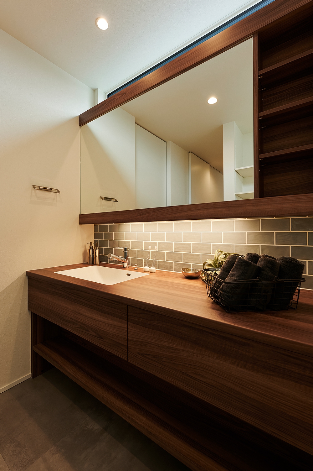 洗面化粧台はキッチンと木目の表情は変えつつも色味は統一して、タイルはスダレ貼りで和を演出