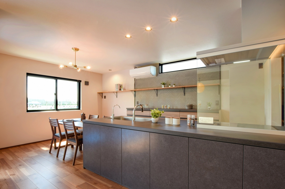 リクシルのリシェルのセラミック天板を採用。高級感を出しつつ、しっかり収納量を備えているため、常にキレイに保てるキッチン。圧倒的な収納力のキッチンカウンター収納を備え、背面の食器棚エリアは一部オープンスペースをつくる