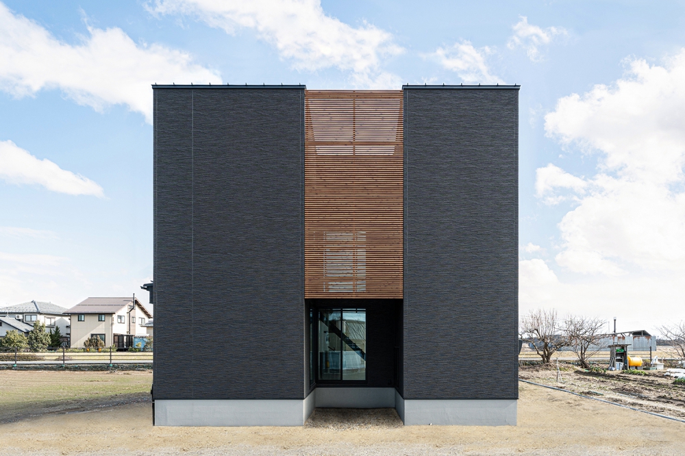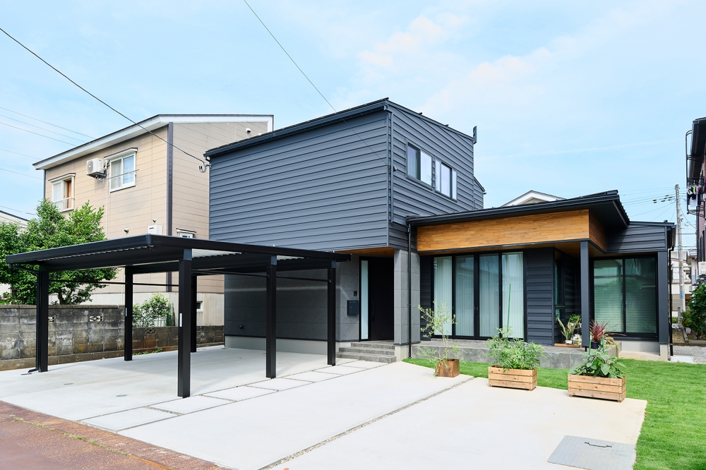 黒の窯業系外壁でシックにまとめた外観。ベースの形は四角くシンプルに。一部アクセントとして木目を加えた