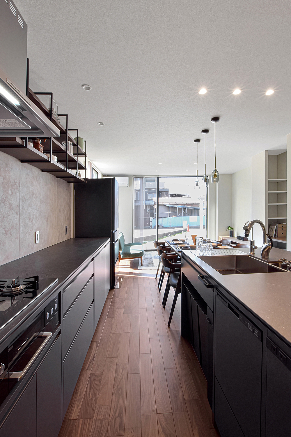 フードから水栓までオールブラックで統一されたアイランドキッチン