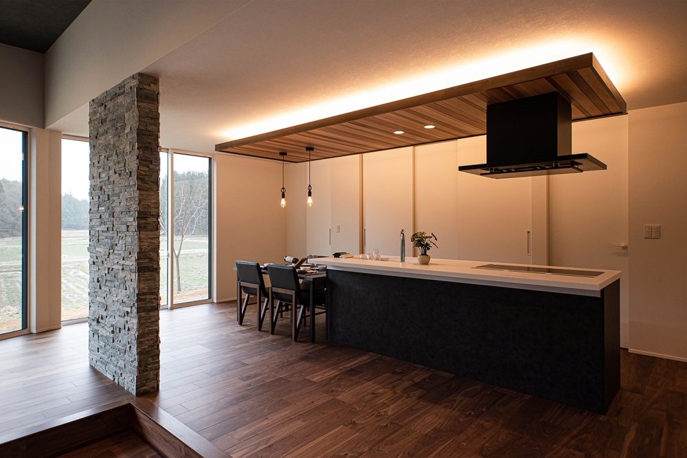 間接照明の柔らかな光と、ほどよく和の雰囲気のあるLDK。床材には滑らかな足触りが魅力の栓(セン)を採用