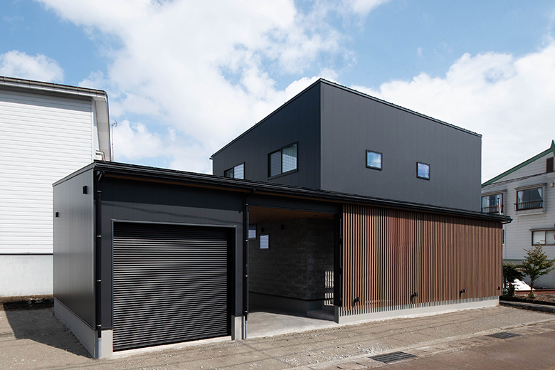 ブラックのガルバリウム鋼板と、SOLIDOを使用したカッコイイ外観。オープンガレージは2台分の車を収容可能