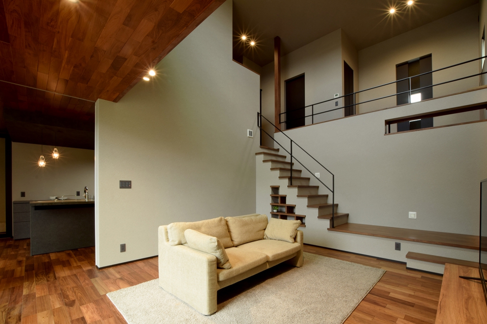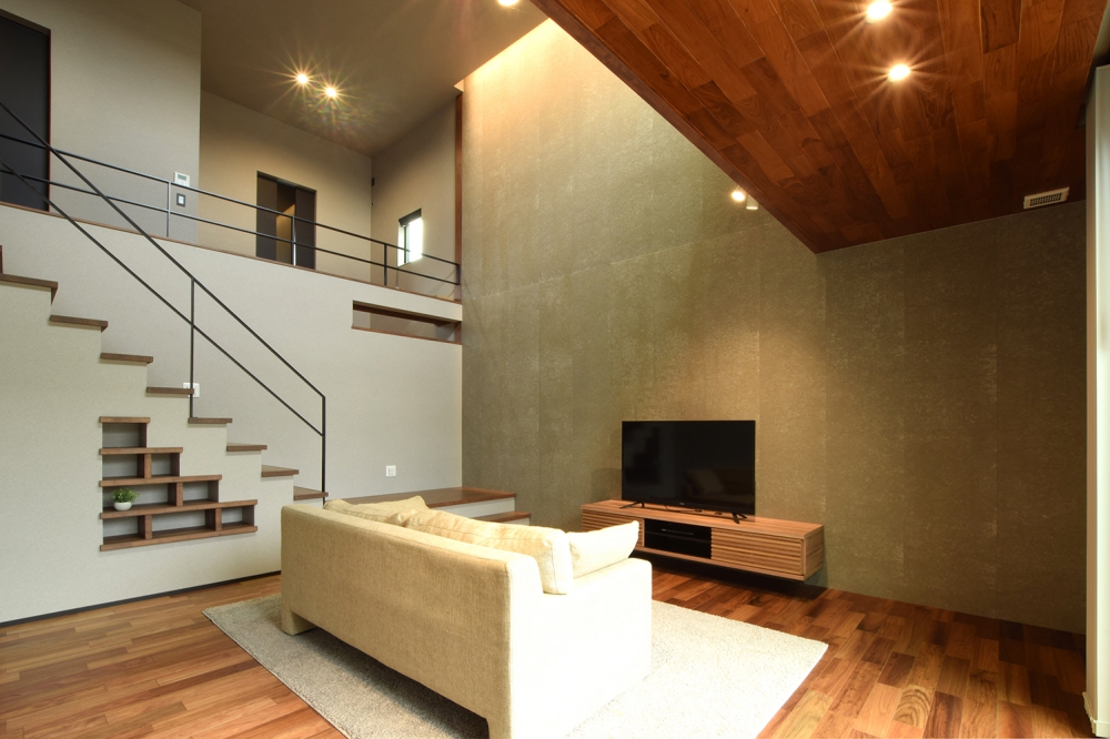 大空間を演出する吹き抜けの間接照明。外の擁壁が視線を遮り、リビングのプライバシーを確保している