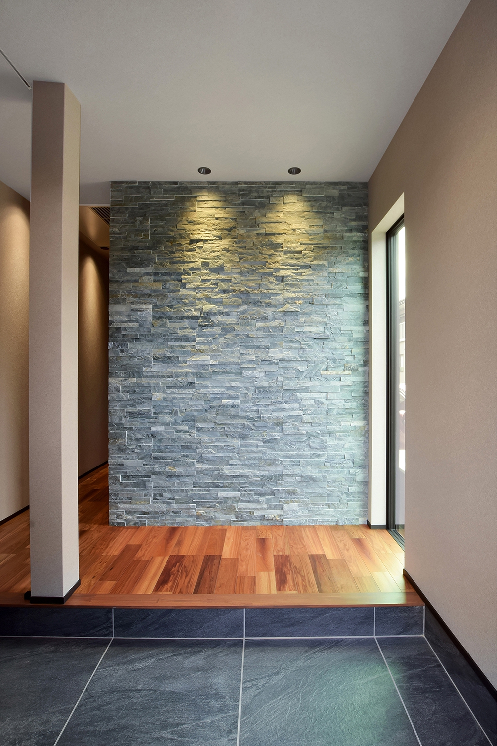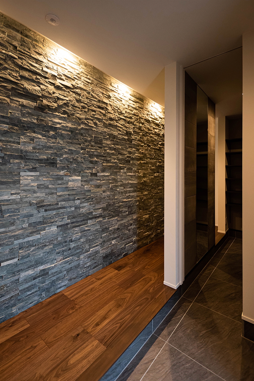 天然石のバンピーウォールで高級感を出し、ポイント照明でタイルを照らし陰影をつけた