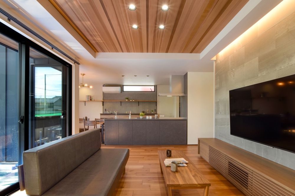 明るめのテイストで、居心地のよいリビング空間。床で採用したアカシアが昼の自然光、夜の照明で表情を変える。アクセントのグレータイル、レッドシダーの濃淡はよく似合う