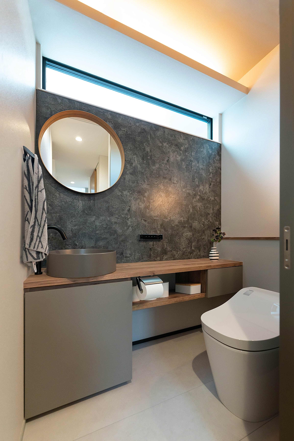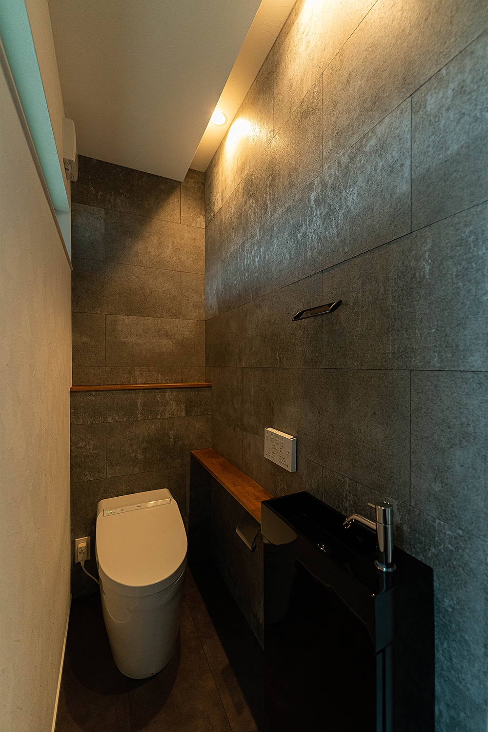 セメント板をアクセントにしたトイレ空間。間接照明が壁面の質感を際立たせ、落ち着いた雰囲気を演出