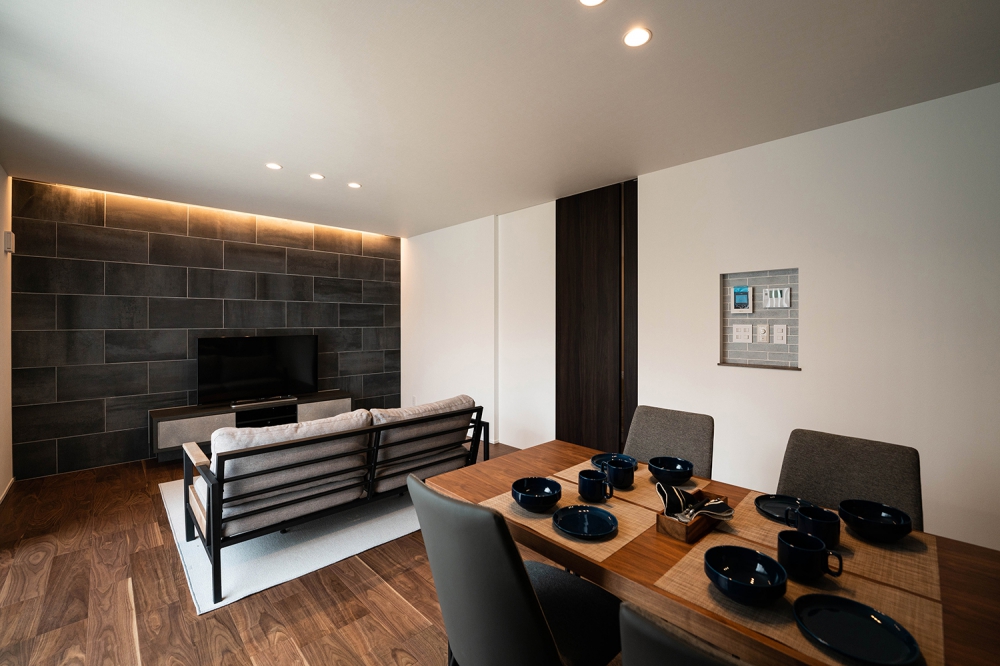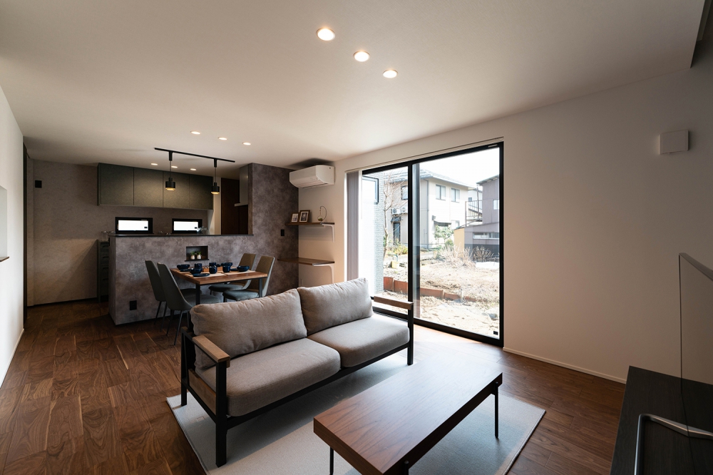 ダークな色味をベースとしたLDK。ウォルナットやグレーのアクセント、黒で統一したサッシや小物が落ち着きのある雰囲気に
