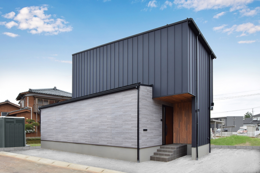 ガルバリウム鋼板とクライマテリアを採用したシックな外装。変形切妻が目を引く外観。
