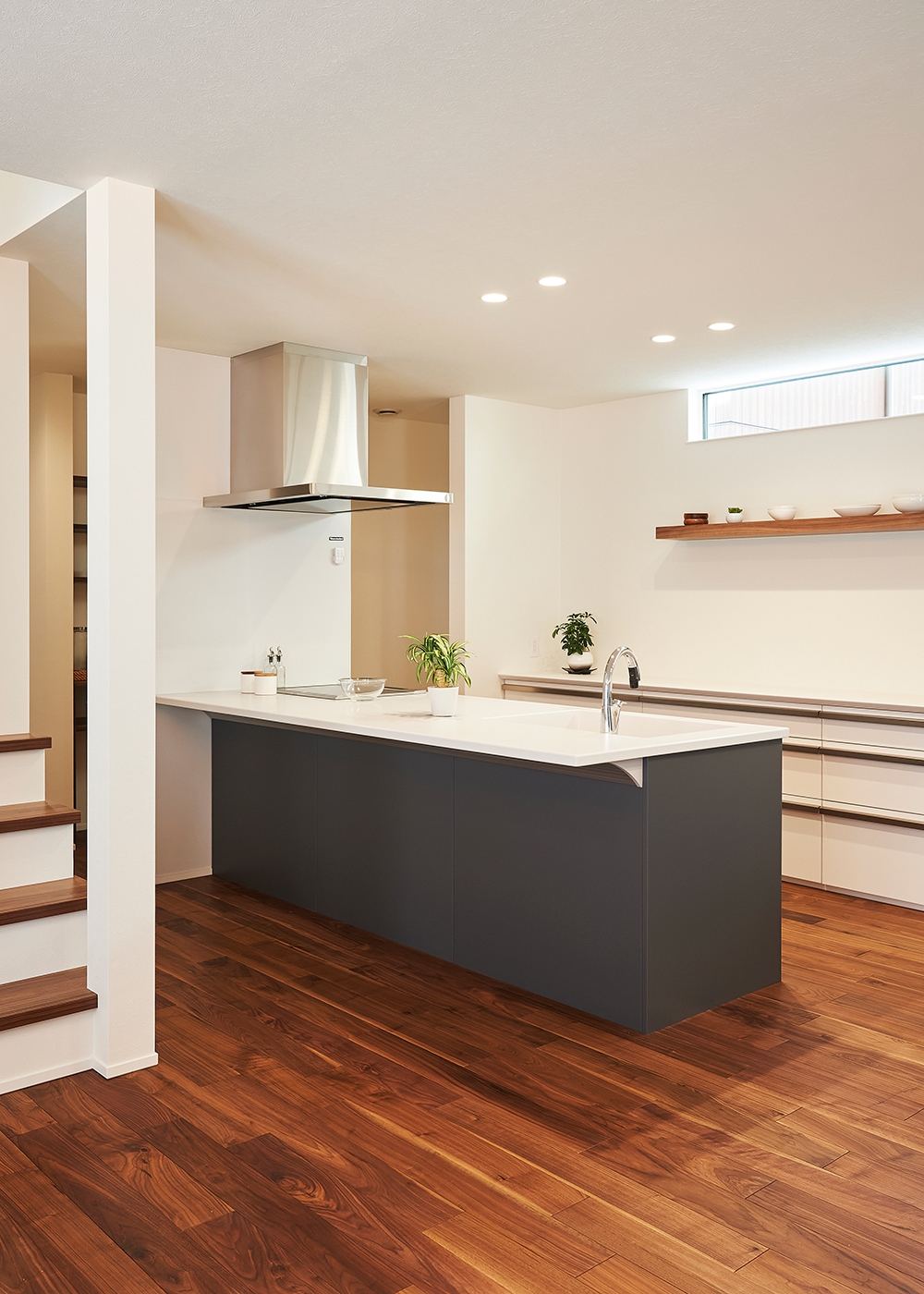 無垢の床の味わいや温もりが心地いい室内。白い壁と木のシンプルなデザインの中に、シックなカラーを効果的に取り入れて空間を引き締めた。キッチンに立つママからはスタディカウンターやLDまで見渡せるのも嬉しい