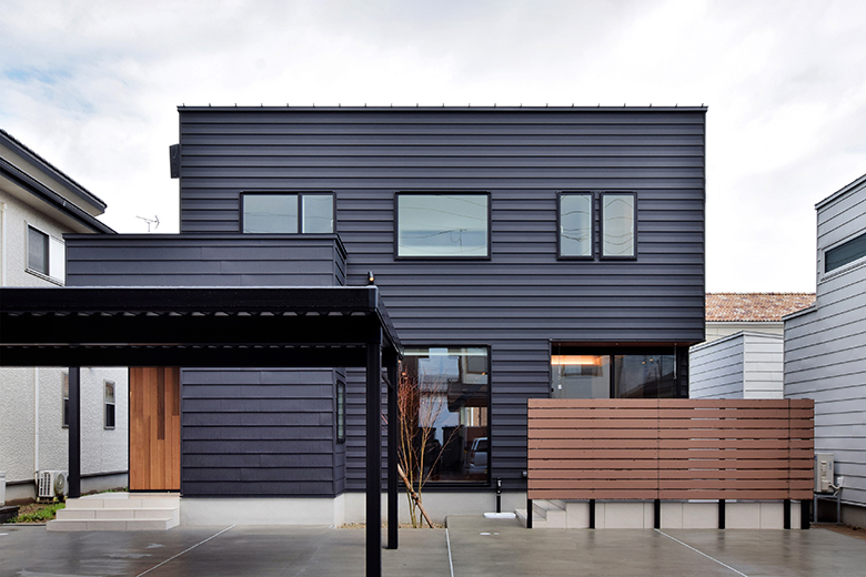 ガルバリウム鋼板とクライマテリアの素材違いを同色のグレーで統一した。サッシとカーポートのブラックが差し色に