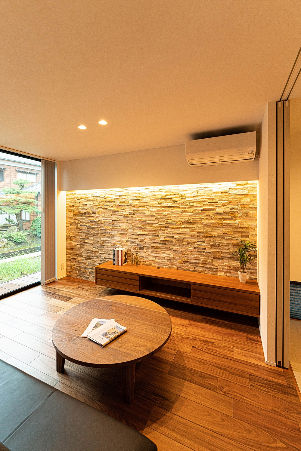 テレビ台の背面には天然石を一面に。間接照明を上から照らし、凹凸の美しさを演出