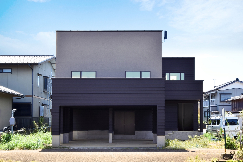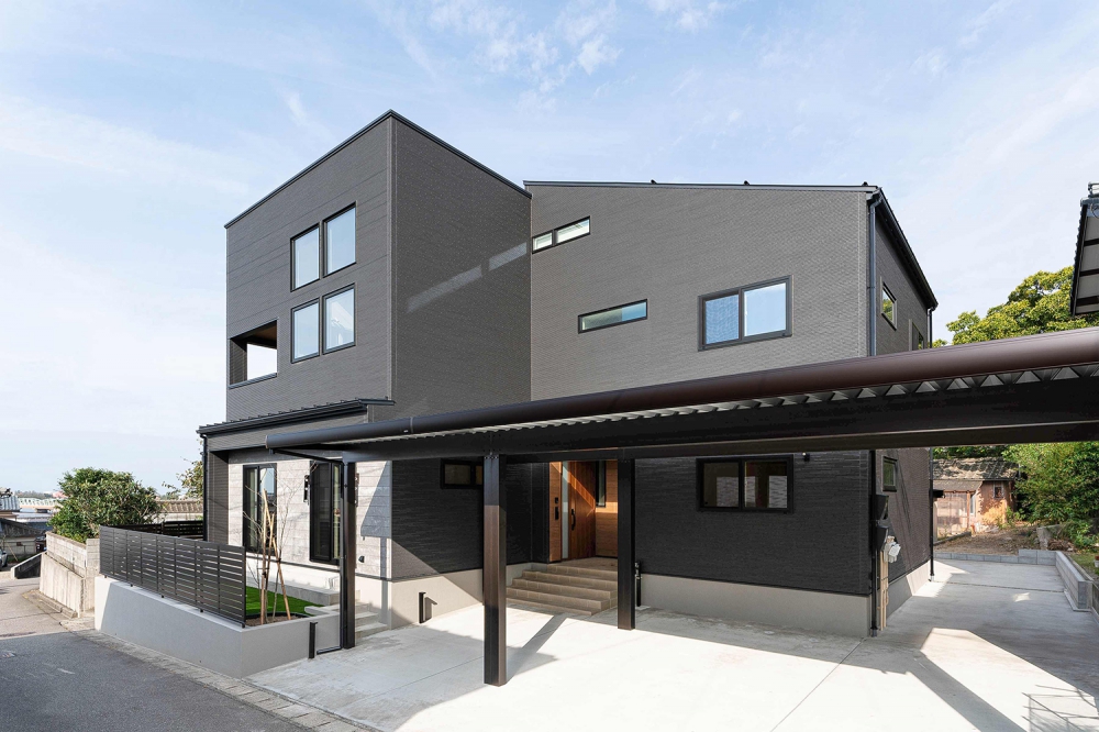 ダークな窯業系サイディングを基調としたファサード。海から近い高台であることを考慮し、潮風に耐えられる色合いと素材を選んだ