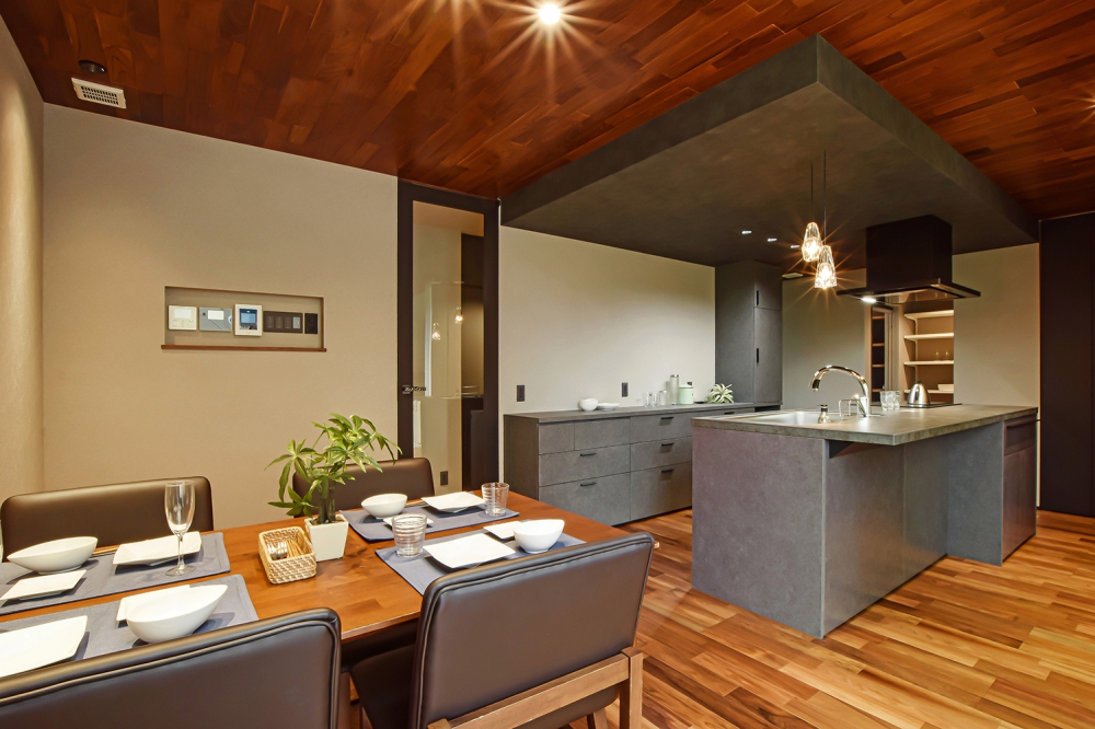 床のウォルナットや天井のレッドシダー、壁の一部にあしらったエコカラットといった素材、間接照明やダウンライトの照明使い、動線や収納計画などこだわり抜いた住まい。