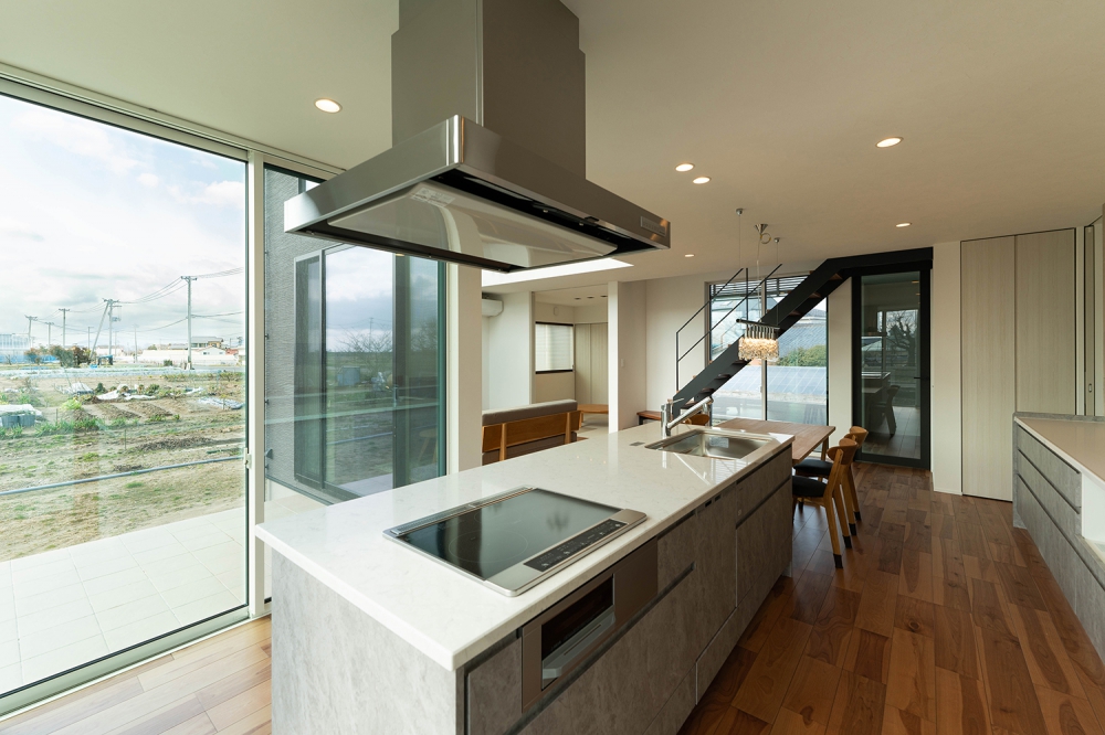 テラスに向かって大きく開いたアイランドキッチン。目線の先には広大な景色が広がり、調理をするのが楽しくなる