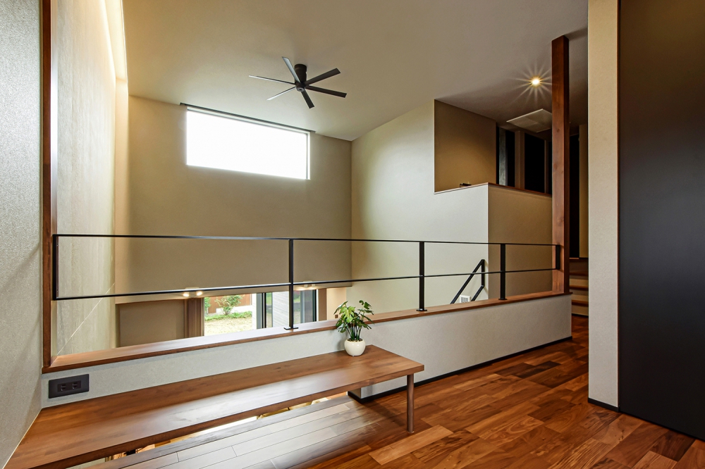 和室の上部に設けた、吹抜けを介して階下と繋がるセカンドリビングは程よく籠れる広さが落ち着く。緩やかに空間同士が繋がる間取り設計が家族の繋がりを深め、各々の場所で好きなことをしていてもお互いの気配を感じられる安心感を生む