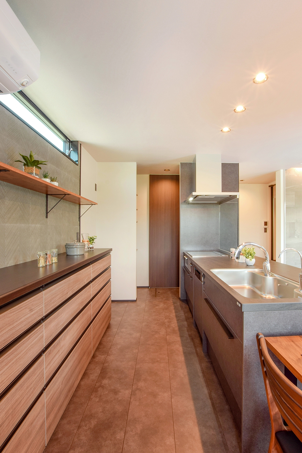 その中で塗壁・セメント板・木板の素材感でアクセント。