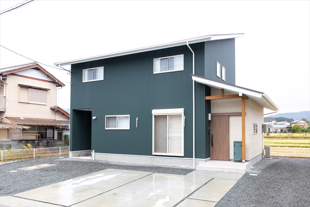 モスグリーンのガルバリウムが自然いっぱいの周囲の景観によく似合います。下屋を大きく伸ばし、玄関横に駐輪スペースをつくりました。