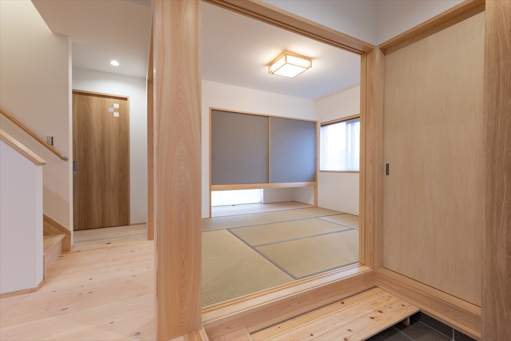 土間から直接出入りできる和室はお父様のお部屋に。水回りへのアクセスの良さも考慮して配置しました。自然とリビングへつながるので、子世帯とのコミュニケーションもとりやすい。
