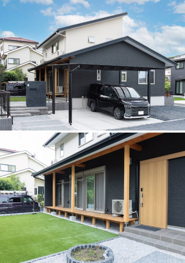 ガルバリウム、窓枠、玄関扉を黒で統一した男前な外観。ウッドデッキの一部は、ご主人がDIYで後から取り付けました。アウトドア好きなS様らしい外と中がつながる住まいです。