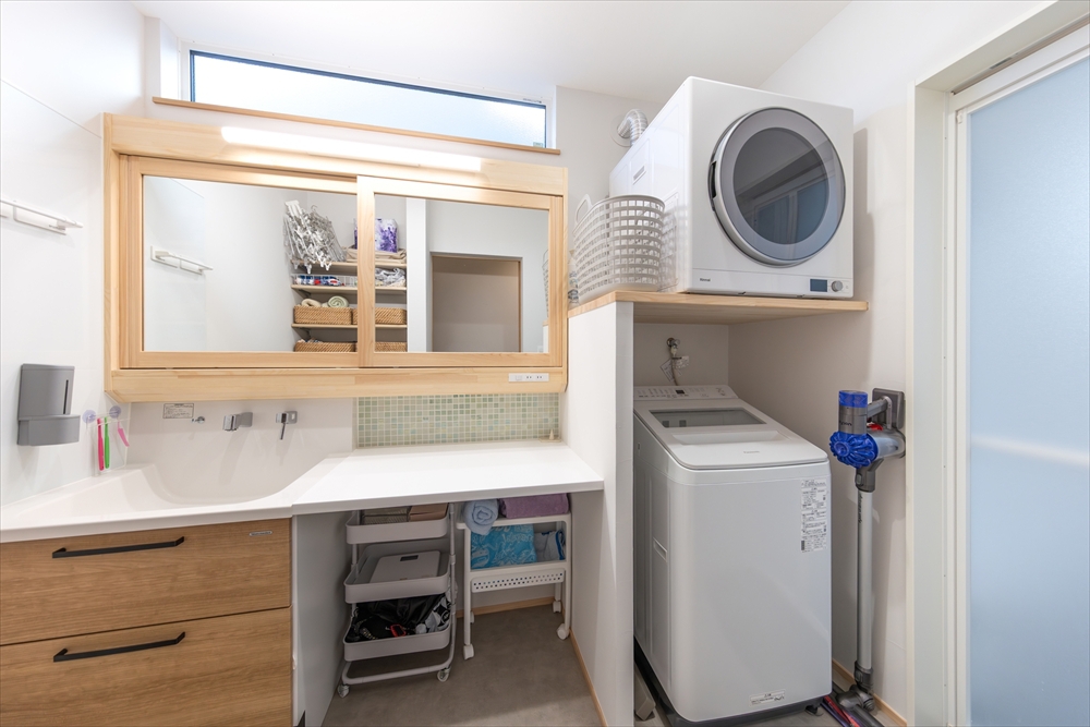 洗面脱衣室にはガス衣類乾燥機を設置。近くにWICを配置しているため、洗濯から収納までがスムーズです。造作ミラーキャビネットとカウンター付きの洗面台で、空間もスッキリ片付きます。