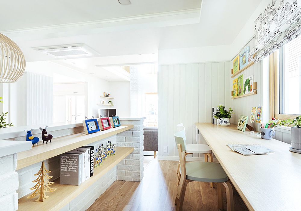 階段を上がったところに多目的なフリースペースを設ける間取りはスウェーデンハウスらしい特徴のひとつ。現在は、この家が建ってから生まれた次女の勉強スペースに。今後、家族の成長とともに使い方が変わっていくことだろう