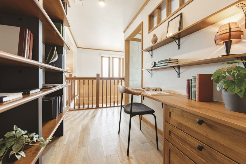 Hさんの書斎として設けられた2階のフリールーム。2つの窓から入る光と、窓のまわりに造り付けた収納棚が印象的。雨の日には洗濯物を干したり、アイロンがけのスペースになったりと家事室としても活躍中
