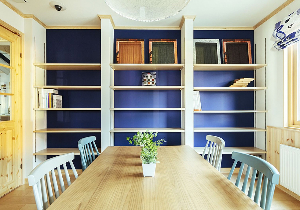 キッチン背面に設けたブルーのアクセントクロスと飾り棚が空間のアクセントに。飾り棚には、季節やその時の気分に合わせてお気に入りの北欧雑貨を飾っている。