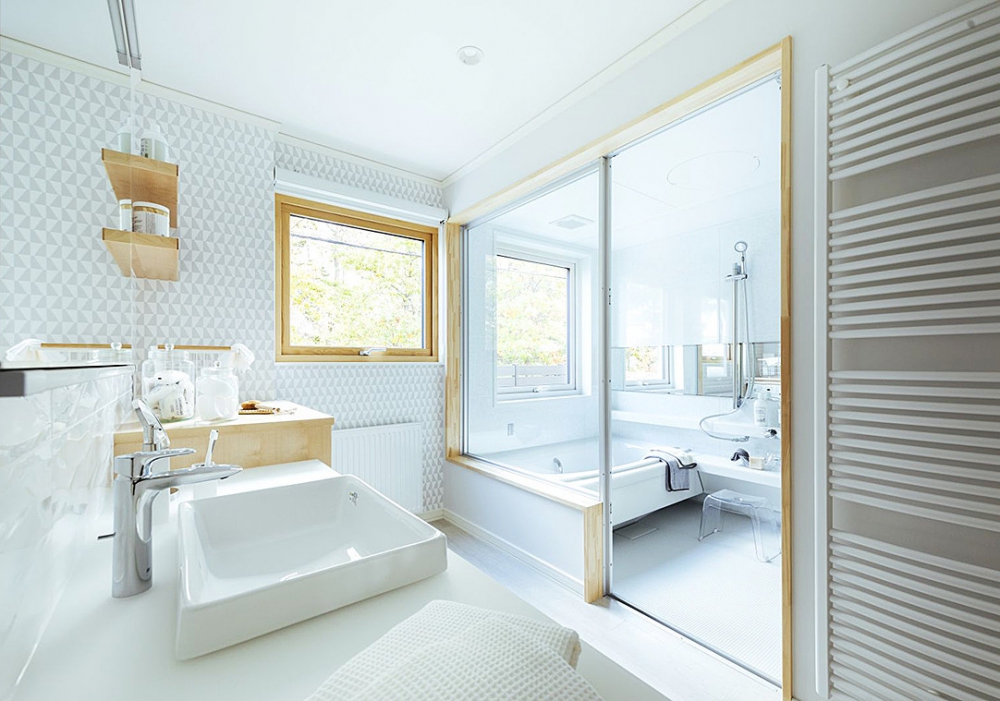 中央の玄関を共有しながらも、左に親世帯、右に子世帯と、それぞれの独立した空間が確保されているH氏邸。2軒の家を共有スペースでつないだような、横長の敷地を活かした形状だ。道路に面した1階浴室は、木製の囲いを目隠しにした坪庭風のしつらえで、入浴中も窓からの眺めが愉しめる