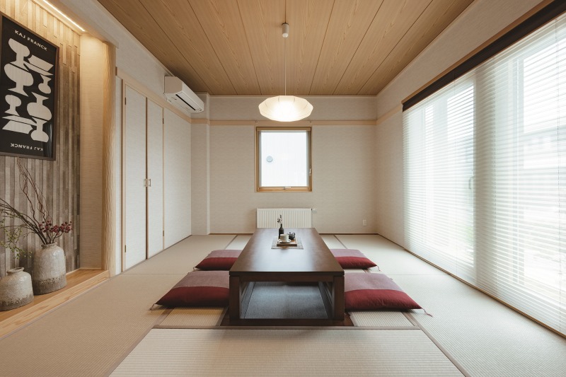 大きな屋根と斜天井が作る開放的な空間設計で、木のぬくもり溢れる快適な空間をご提案。実用性に基づいた控えめな美しさに適度なデザインを織り込むことで、自然な優しさの中に現代的要素を取り入れた柔らかい雰囲気を作り上げました。