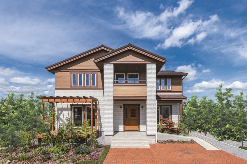 1階にタイル、2階に縦サイディングを使ったシンメトリーの美しい外観。本格的な和室を構えたゆとりある空間は、住む人の心を満たします。
