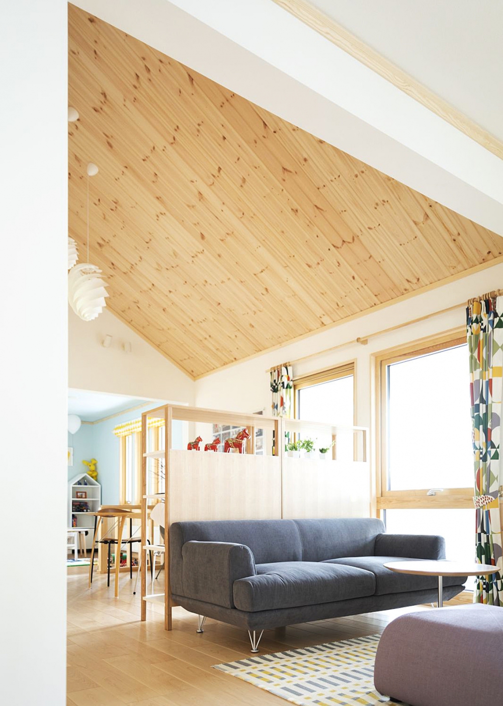 勾配天井で開放感を演出した子世帯LDK。間仕切りのない空間は、いつでも家族の気配を感じることができる