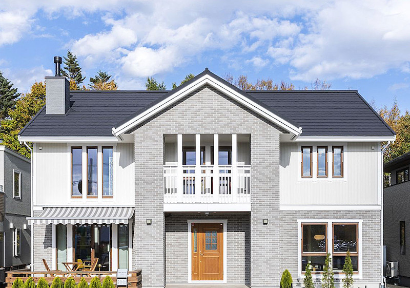 外観はミッドナイトブルーとホワイトのツートーンカラーでコーディネート。大きなウッドバルコニーも設置し、存在感ある佇まいに