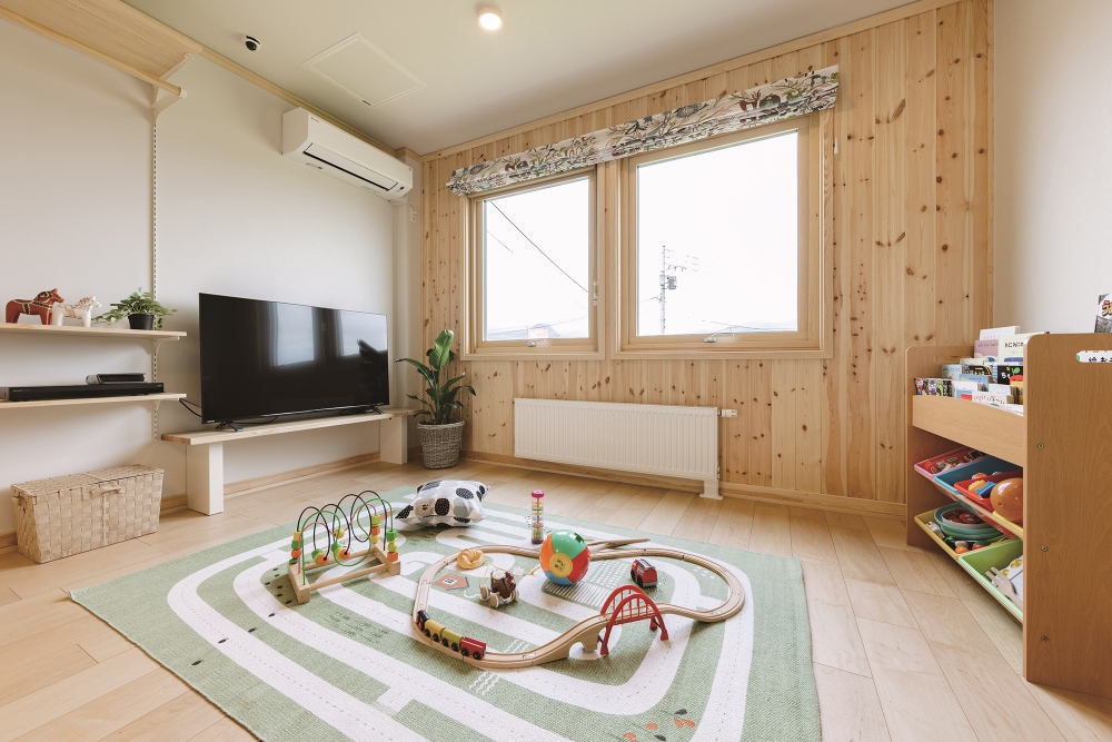 広いLDK空間の一角を利用して、お子様の遊び場に。キッチンで料理をしながら、お子様を見守ることができる