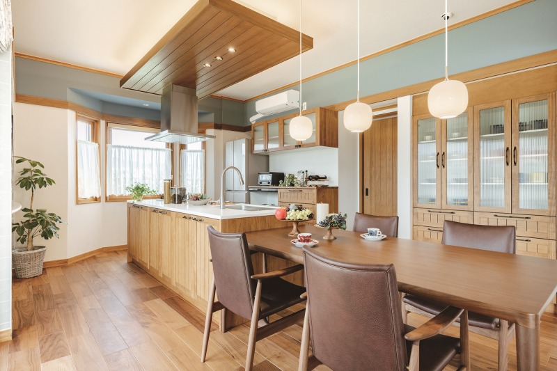 「森をイメージし、ダイニングのペンダントライトは松ぼっくりに、キッチンのライトはどんぐりの形にしました」と遊び心を語るMさん。収納を中心に行き止まりのない動線を採用し、水回りへのアクセスをスムーズにしたのも設計のポイント