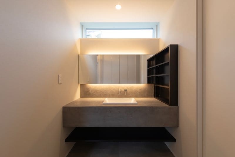お施主様のこだわりが詰まった、モルタル仕上げの造作洗面台。無機質な表情を持つモルタル(モルテックス)は、水にも強く、洗面台に最適な素材です。朝日が差し込む窓と、柔らかな光を灯す間接照明が、空間にあたたかみを与えます。