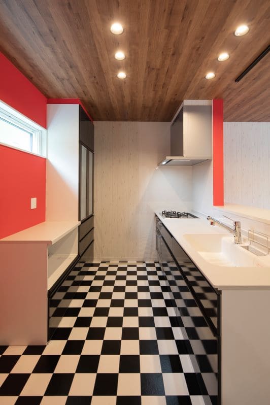 まるでオールドアメリカンなダイナーにいるような、遊び心あふれるキッチン。床のチェッカーフラッグ柄と鮮やかな赤壁が空間の主役です。この個性的なキッチンなら、毎日の料理の時間もきっと楽しくなることでしょう。