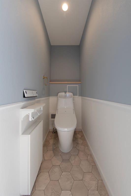 上部は北欧らしいやわらかなブルーグレーのクロス、下部は清潔感のある白い腰壁で、やさしい雰囲気に包まれた空間です。腰壁の色分けが視覚的な奥行きを生み、コンパクトながらも広がりを感じられます。床にはハニカム柄のタイルを採用し、細部までこだわりを感じるインテリアに。毎日使う場所だからこそ、居心地の良さを大切にしました。