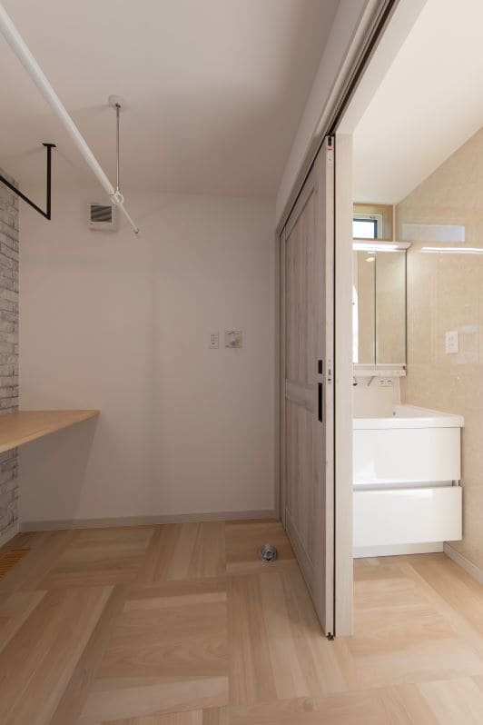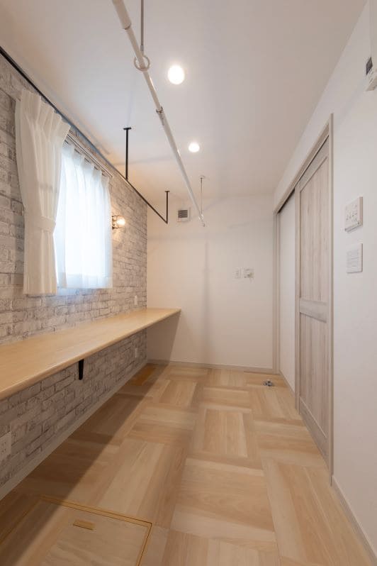 洗濯に関する家事がこの一室でやさしく完結する、家事ラク空間。カウンターでゆったりと洗濯物を畳め、カウンター下には衣装ケースを収納できるスペースを設けました。雨の日も室内干しができるので、毎日の洗濯がストレスフリーに。暮らしにやさしいゆとりを生む工夫です。