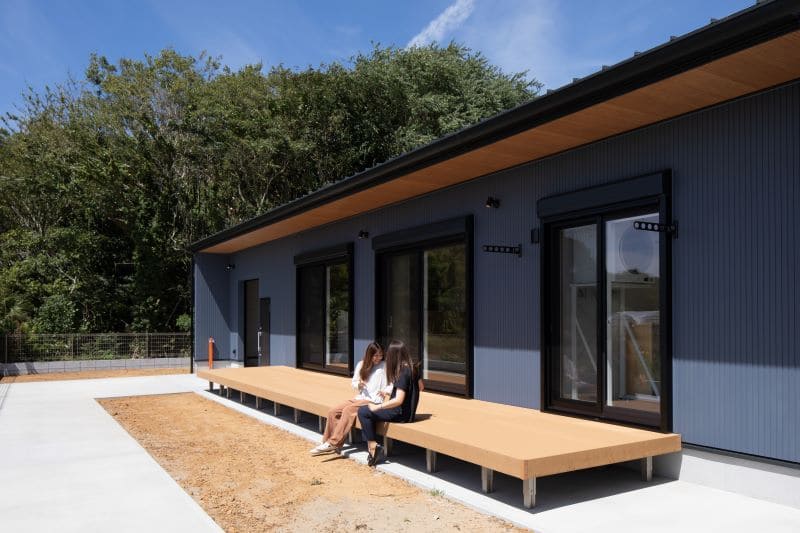 平屋のような印象を与える二階建ての住まい。目を引く深い軒は、室内の窓と絶妙なバランスで配置し、美しい調和を生み出しました。リビングからフラットに続く広々としたウッドデッキは、陽光を浴びながら、開放的で快適なアウトドアリビングとして活用できます。