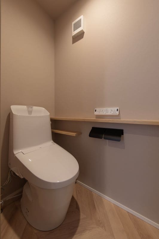 落ち着いたグレーの壁が、心を落ち着かせるトイレ空間を演出。カウンターを設けることで、機能性とデザイン性を両立させました。