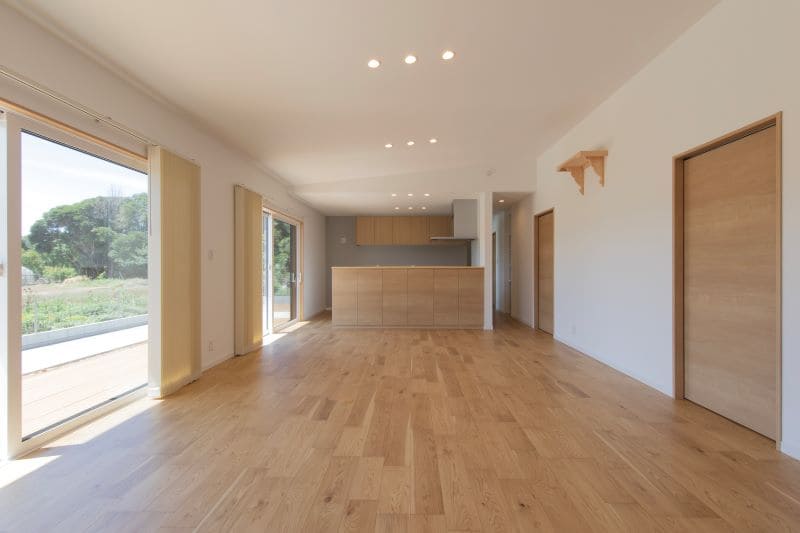 勾配天井で縦の広がりが加わった、約26帖の広大なLDK。木の質感と相まって、明るく落ち着いた空間が広がります。